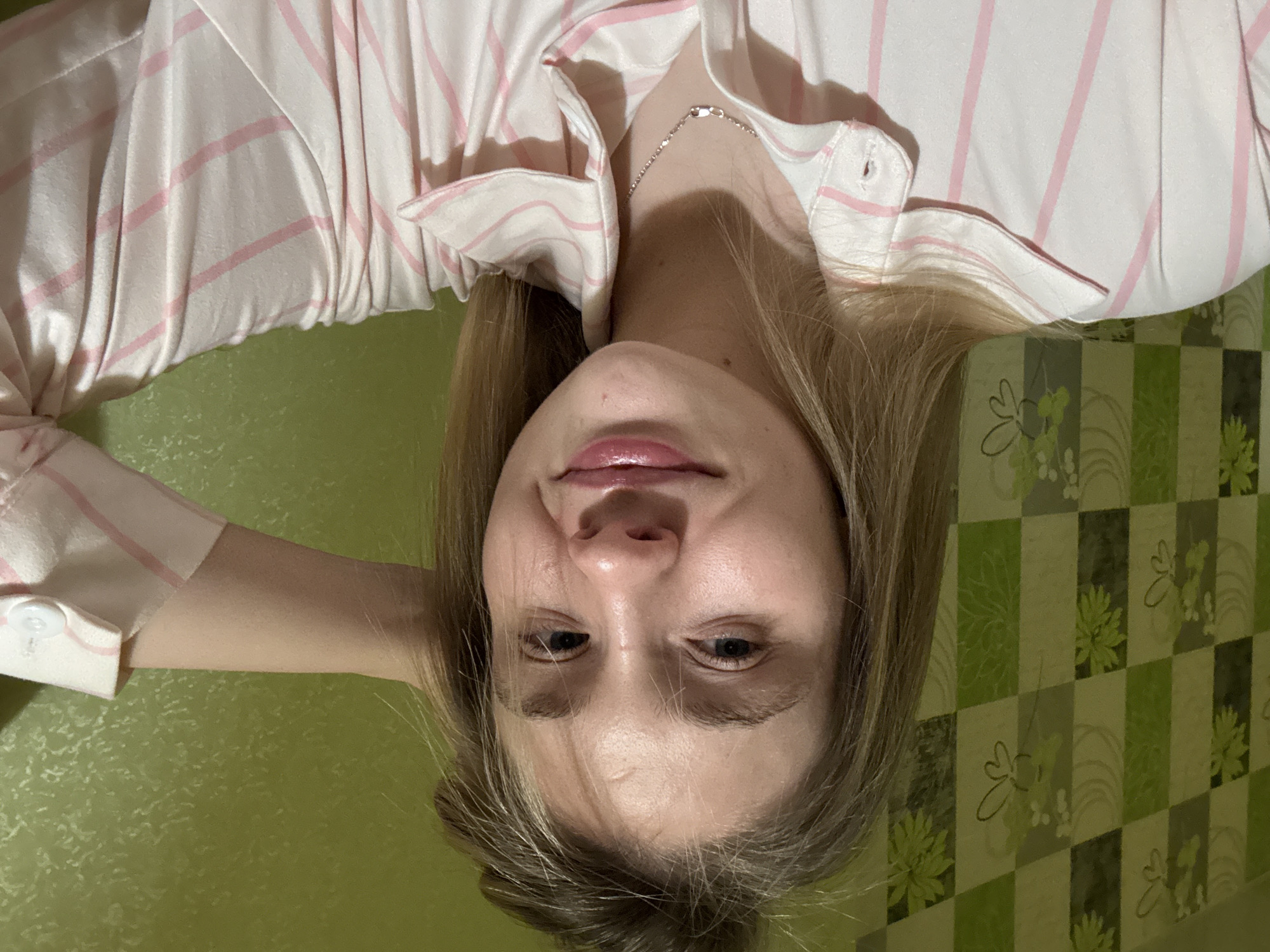 The image is a selfie taken from an upside-down perspective. A young woman with fair skin and light brown hair is the central subject. She is wearing a light-colored, striped pajama top and a delicate silver necklace. The background consists of a green surface that transitions into a patterned wall, possibly located in a home in Izhevsk, Russia. The wall features a checkered design with floral motifs.