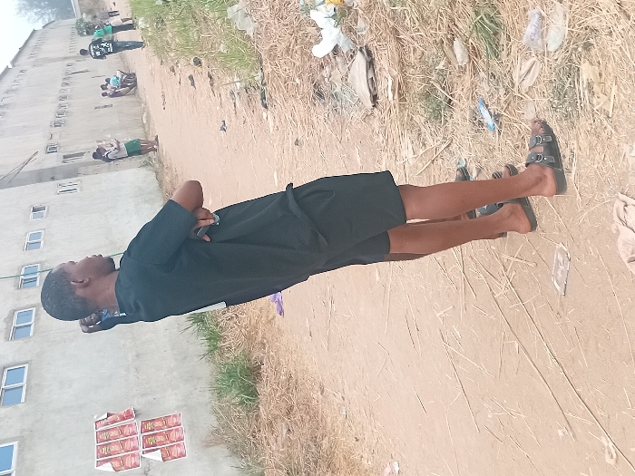 A man in a black shirt and shorts, wearing black sandals, stands on a dirt path. He is looking toward the left side of the image. Behind him is a gray building with multiple windows. To the right, there is a field of dry grass and debris. Other people are seen in the distance, lying down in the field. A stack of boxes with a label is near the building.