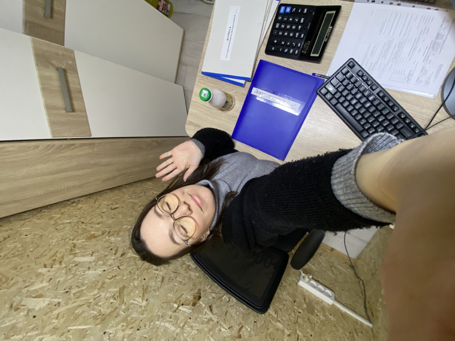 An indoor scene in the city of Ol'khovskoye, Russia, depicts a female individual seated at a light-colored wooden desk within what appears to be an office or workspace. The subject, a woman with dark hair and wearing glasses, is dressed in a grey turtleneck sweater and a dark, possibly black, long-sleeved garment with ribbed cuffs. She is positioned in a black office chair. Her right hand is raised, palm forward, in a waving gesture, while her eyes are slightly closed. Her left arm is extended, holding the camera to capture a high-angle selfie. The wall behind her is clad in Oriented Strand Board (OSB), and to her right, two tall cabinets with light wood and white laminate panels, featuring silver handles, are visible. On the desk, from left to right, are a light-colored bottle with a green cap, a blue folder, a stack of white papers in a binder labeled "ЖУРНАЛ" (JOURNAL), and a black STAFF ST-1910-12 calculator. A compact black keyboard is situated towards the bottom right of the frame, with additional papers, possibly forms, underneath it. A pen is also visible on the desk. To the left of the chair, a white power strip with three visible outlets is on a lower surface.