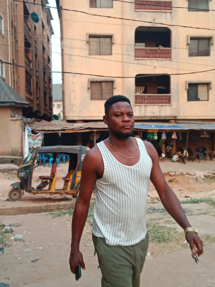 A man with short black hair, wearing a striped tank top and khaki pants, walks on a dirt road. He has a gold chain and watch. Buildings stand behind him, one with multiple windows and balconies. A three-wheeled vehicle is parked nearby. A covered market area is visible in the background. The man holds a phone in one hand and keys in the other.