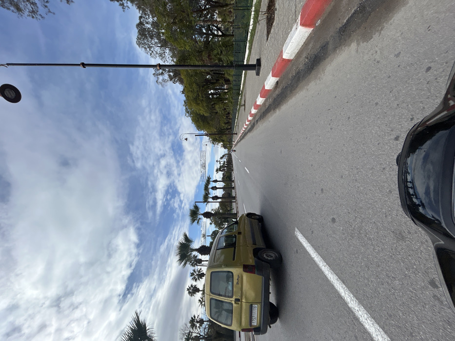 The image depicts a wide, multi-lane asphalt road in Mechouar Fes Jdid, Morocco, viewed from a low, forward-facing perspective, likely from the dashboard of a scooter or motorcycle. A gold/yellow Peugeot Partner van, bearing Moroccan license plate "17571 | 116," occupies the left lane, moving away from the viewer. Further in the distance, a small, dark-colored motorcycle or scooter is visible in the center of the road, also moving away. To the left of the road, a median strip is lined with numerous mature palm trees, extending into the distance. Several decorative archway structures are visible spanning across the median in the background. To the right of the road, a paved sidewalk with a red and white painted curb runs parallel to the street. Beyond the sidewalk is a green space or park area featuring numerous trees, some smaller plantings, and a dark green metal fence. Tall, black lampposts with circular light fixtures are regularly spaced along the right side, between the sidewalk and the green space. The sky above is partially overcast with scattered white and grey clouds against a blue background.