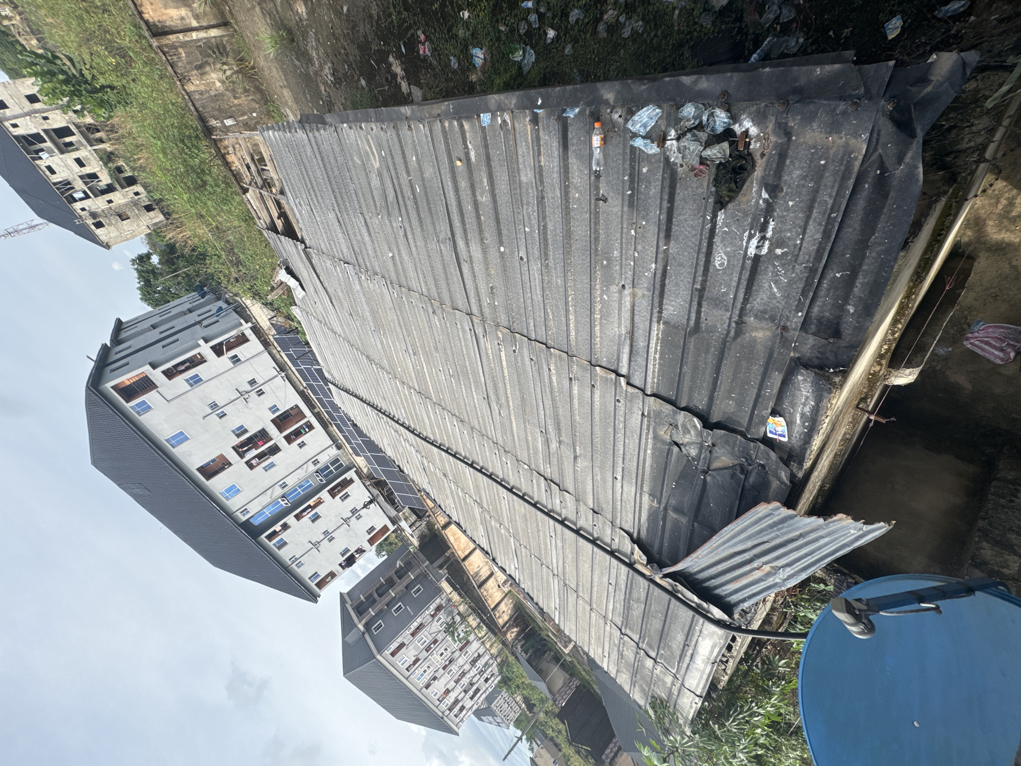 This image shows a view in Ihiagwa, Nigeria, looking up at a corrugated metal roof covered in litter