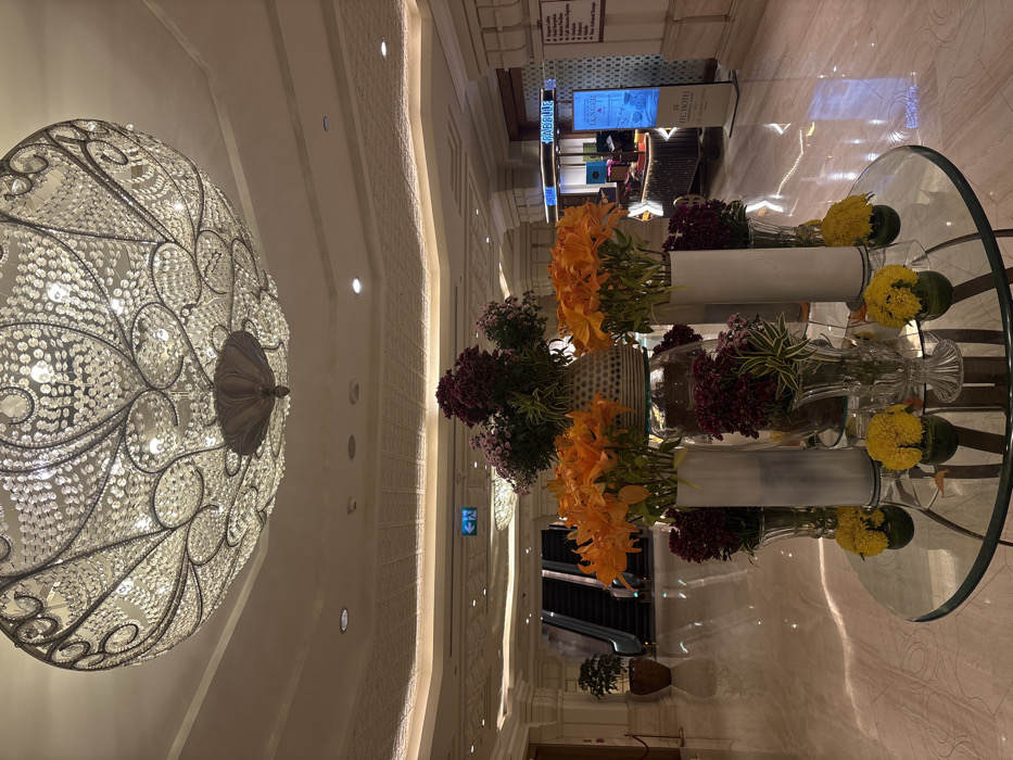 An ornate chandelier hangs from the ceiling in a luxurious building. A round glass table displays flower arrangements in varying shades of orange, yellow, and deep red/purple. A restaurant or cafe is visible in the background, as well as an escalator. The building's architecture features patterned walls and illuminated accents. The scene exudes an atmosphere of opulence and sophistication.