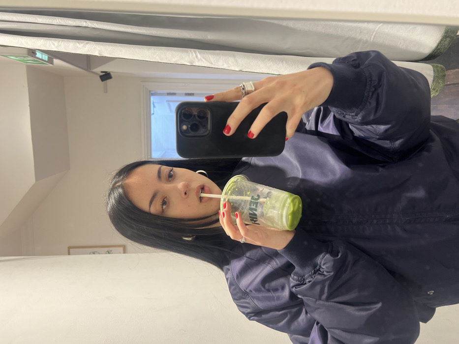 A female subject with long dark hair, light eyes, wearing a navy blue bomber jacket, multiple silver-toned rings, and red nail polish, takes a mirror selfie. She holds a black smartphone (likely an iPhone Pro model) in her right hand and a clear plastic cup containing a green beverage (possibly matcha) with a white straw in her left hand, from which she is drinking. The cup features the reversed logo "GRIND". The indoor environment displays a plain white wall to the left, and a light gray curtain to the right. An illuminated green emergency exit sign, typical of UK establishments, is visible above the curtain, next to a small black wall-mounted speaker or sensor. A reflected white doorway is visible in the background, leading to a brighter area. The location is a GRIND coffee shop or establishment within London, United Kingdom.