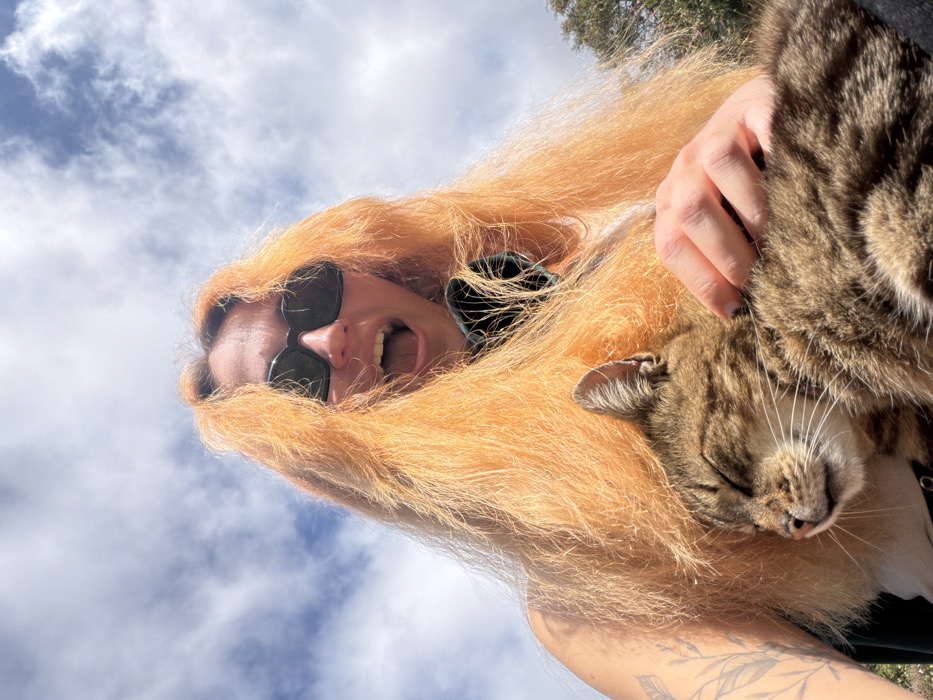 - "A low-angle outdoor portrait features an individual with voluminous, bright orange hair and dark rectangular sunglasses, looking upwards with an open mouth" by FM-R7RZz2, licensed under CC BY 4.0