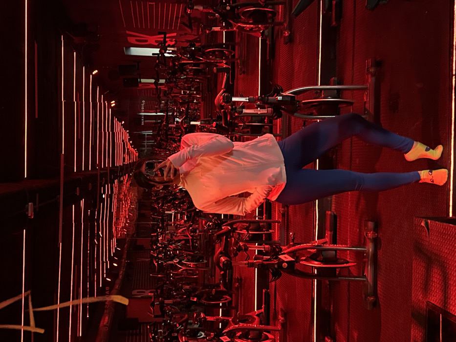 An individual is depicted taking a mirror selfie inside a BAJA STUDIO cycling facility in Puebla City, Mexico