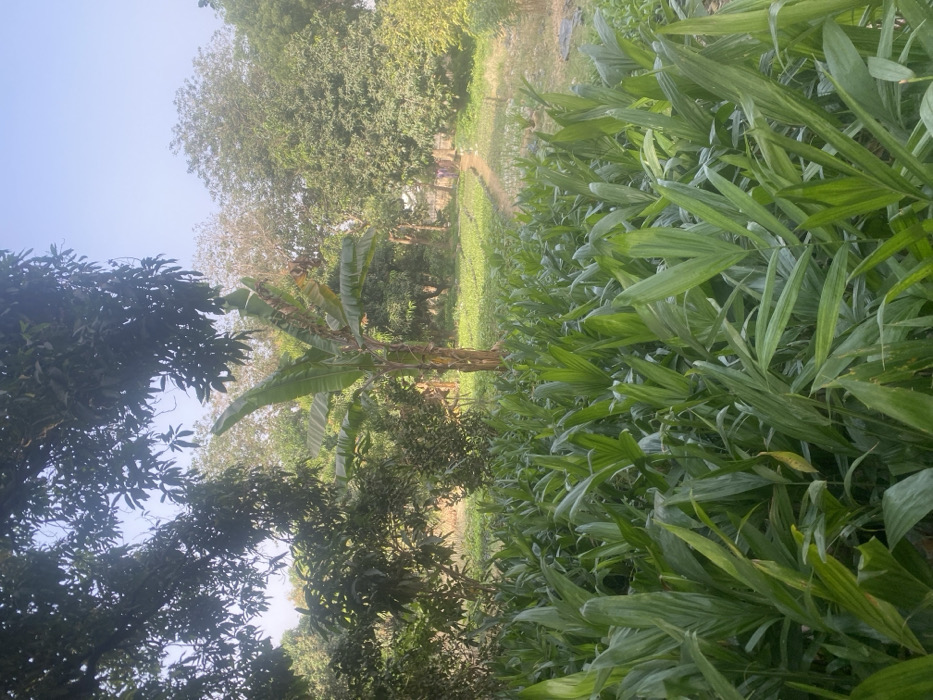 The image displays an outdoor agricultural or garden scene under clear daylight, located in the city of Unknown, Unknown. The foreground is dominated by a dense, uniform field of green plants with broad leaves. In the midground, a distinct banana tree stands to the left of a narrow, light-colored dirt path that curves into the background. Surrounding the path and banana tree are various other trees and shrubs with green foliage. In the far background, a small, indistinct, light-colored figure is faintly visible near the path on the right side of the frame. The upper portion of the image reveals a clear, light blue sky above the tree canopy. No specific actions or interactions are discernible from the distant figure.