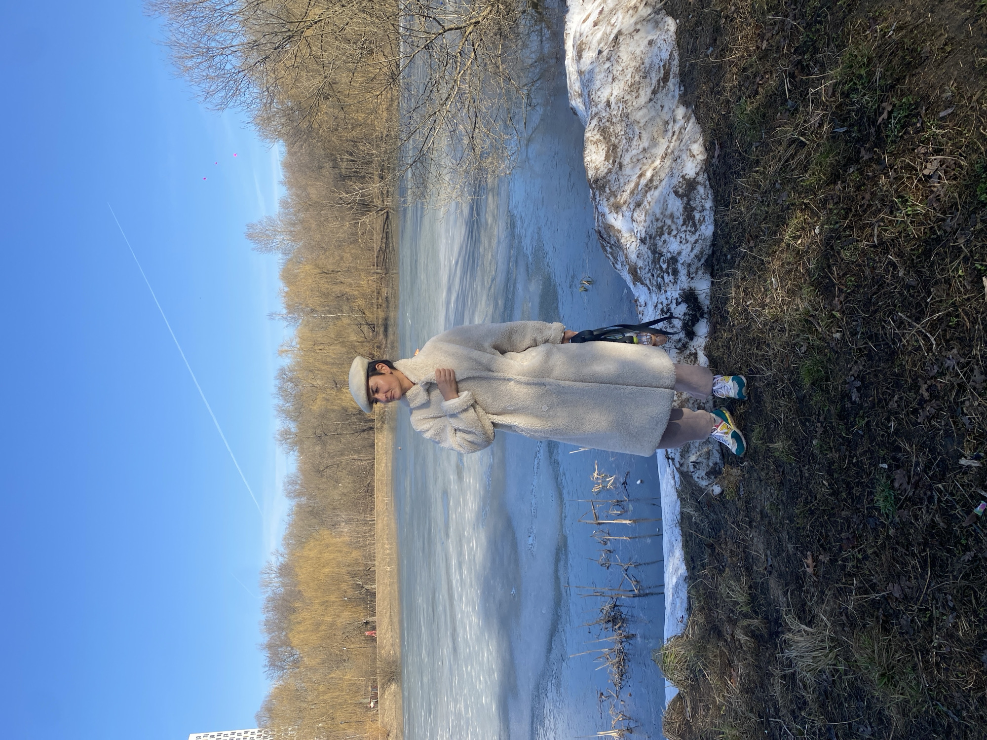 A person wearing a light-colored coat and hat stands beside a frozen body of water, likely a pond or lake. Patches of snow are visible on the ground, indicating a cold climate. The background features bare trees, suggesting a late winter or early spring setting. The photo was taken on a clear day, with a bright blue sky visible above. The scene is likely in Moscow, Russia, as indicated by the prompt.