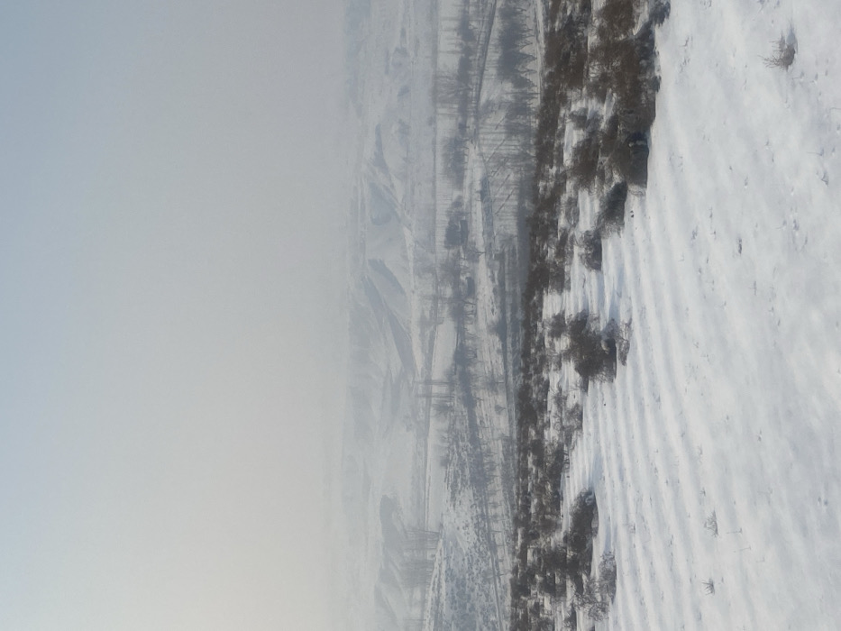 Location: Marhamat, Uzbekistan. The image depicts a vast, snow-covered winter landscape under an overcast, hazy sky. In the immediate foreground, a field of fresh snow displays numerous parallel, linear depressions or ridges, possibly indicating cultivation rows or tracks. Scattered across this foreground are numerous low-lying, dark-brown, leafless bushes or shrubs, partially coated with snow. Beyond the foreground, the terrain gently descends into a midground valley or plain, also blanketed in snow. This area contains clusters and linear arrangements of bare, deciduous trees, their dark branches stark against the white snow. Indistinct, small structures, possibly rural dwellings or farm buildings, are interspersed among the trees in the midground. A winding feature, possibly a path or road, flanked by trees, traverses this area. The background consists of a series of snow-covered hills and mountains, receding into a prominent atmospheric haze. Their slopes appear smooth and rounded. The sky, occupying the upper portion of the frame, is a uniform, pale grey-blue, indicating an overcast condition with diffused light. No people, animals, or specific actions are discernible within the scene.