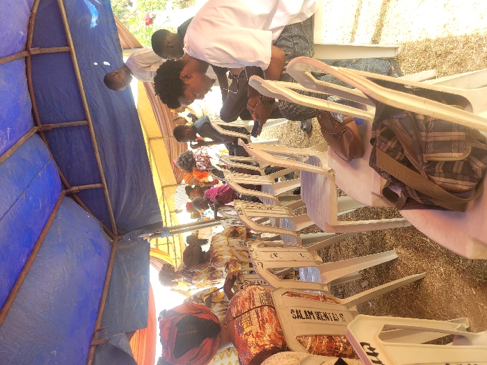 A gathering of people sits in rows of white plastic chairs under a blue and orange tent. Several individuals, dressed in formal attire, engage in conversation towards the front. The setting suggests an outdoor event, with dry grass visible under the chairs. A plaid bag and brown shoe are on a nearby table, and markings on the chairs read "SALAM".