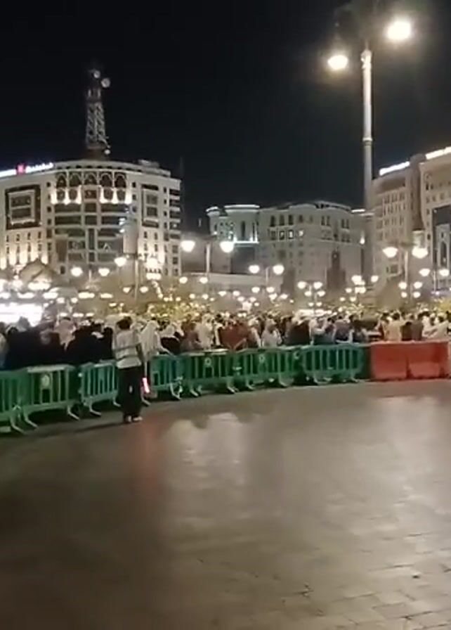 At night, a large crowd of people is gathered behind green and orange barriers in a city square. Many people are wearing white clothing and head coverings. The square is lit by streetlights and the buildings in the background are brightly lit. The ground is paved and wet. The overall atmosphere appears to be busy and potentially festive.