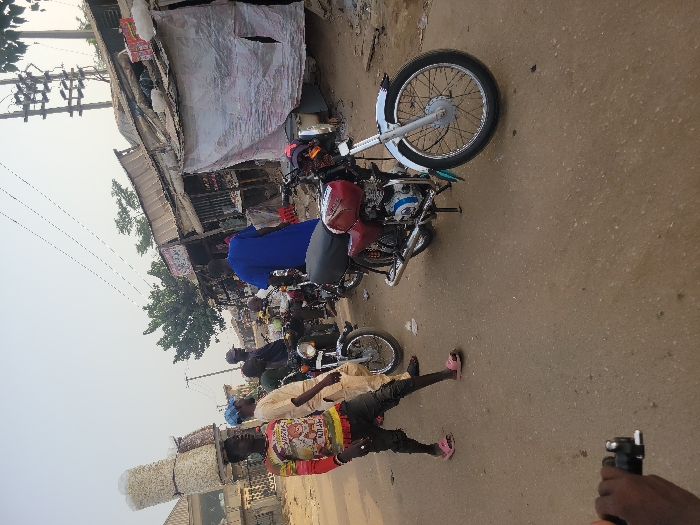 The image depicts an outdoor street scene in Sabojibi, Nigeria, under a hazy sky