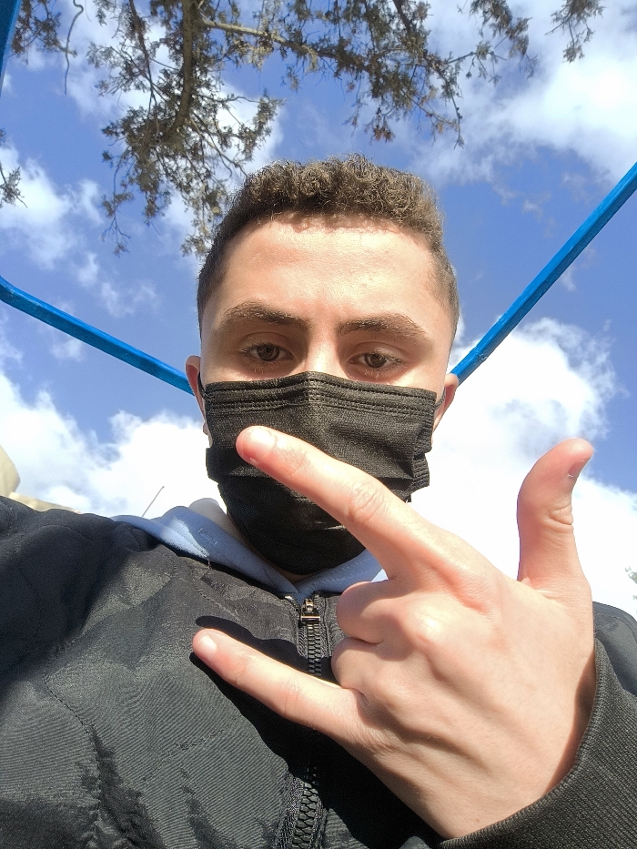 A young male individual is depicted in a close-up, low-angle self-portrait taken outdoors in Jirud, Syria