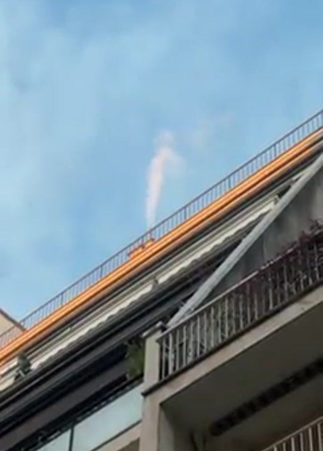 A vertical plume of smoke rises into the sky from a rooftop exhaust vent