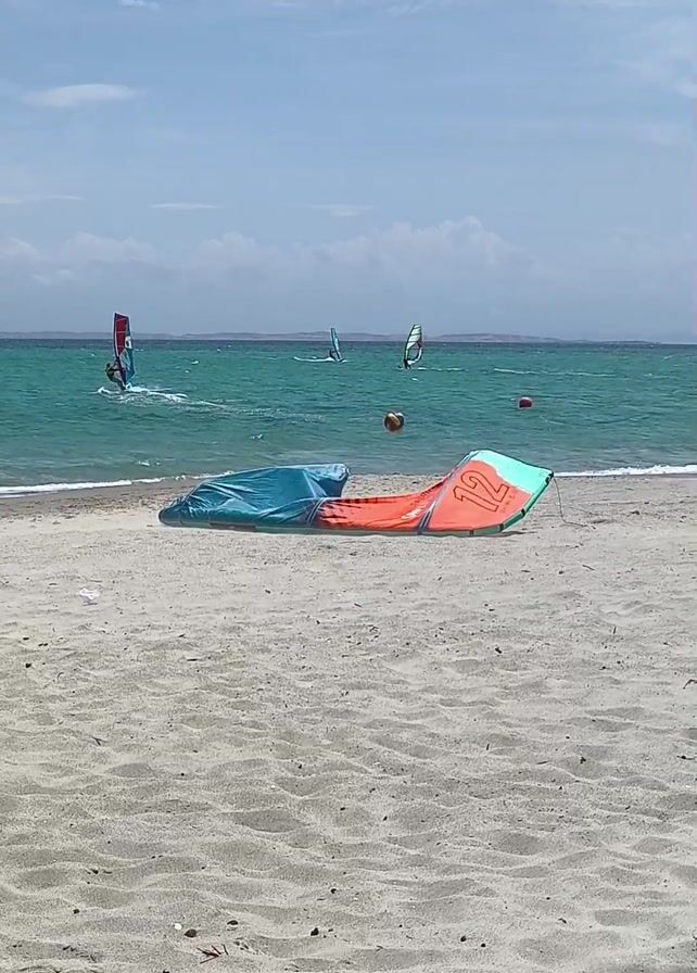 The scene captures a beach on a moderately windy day, indicated by the presence of several windsurfers on the turquoise sea. In the foreground, a deflated kite lies on the sandy beach, displaying a combination of blue and orange colors and the number "12." Further out in the water, three windsurfers can be seen gliding across the waves, their colorful sails adding vibrancy to the scene. The sky above is partially covered with fluffy white clouds.