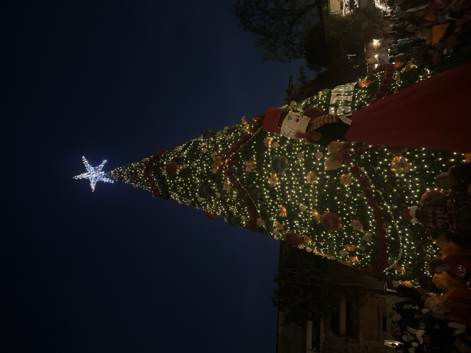 - "A grand Christmas tree stands illuminated against a dark blue sky" by FM-IlG2F3, licensed under CC BY 4.0