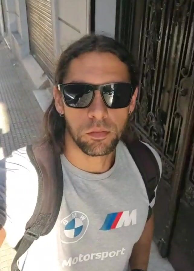 A man with long hair pulled back, wearing sunglasses and a grey BMW Motorsport t-shirt, stands on a sidewalk, holding a Heineken can, and takes a drink from it
