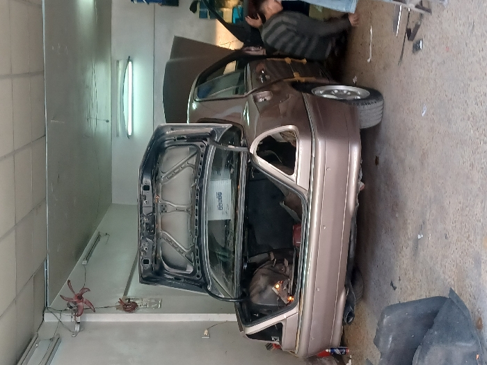 In a workshop in As-Sabina, Syria, a light brown four-door sedan, possibly a Mercedes-Benz C-Class, is undergoing repair