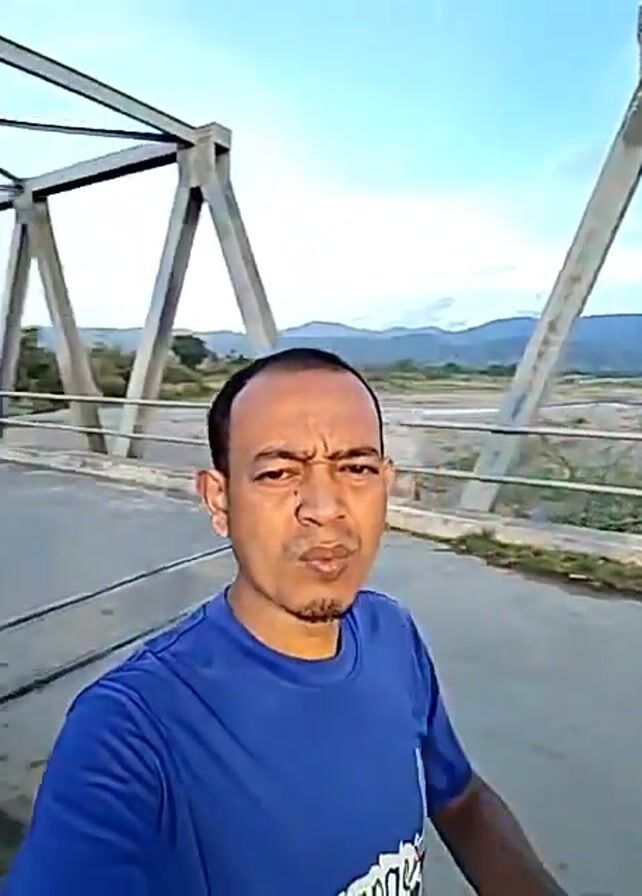 A man with a shaved head and wearing a blue t-shirt is holding a cigarette and looking at the camera. He is standing on a steel bridge with a river visible on either side. The bridge has metal support structures creating a triangle pattern above the man. In the background are distant mountains. The man appears to be filming himself. A motorcycle is parked further down the bridge. Later in the video, the man is still smoking and the camera pans to show dogs walking on the bridge in the background. There are yellow flowering plants on the side of the riverbank.