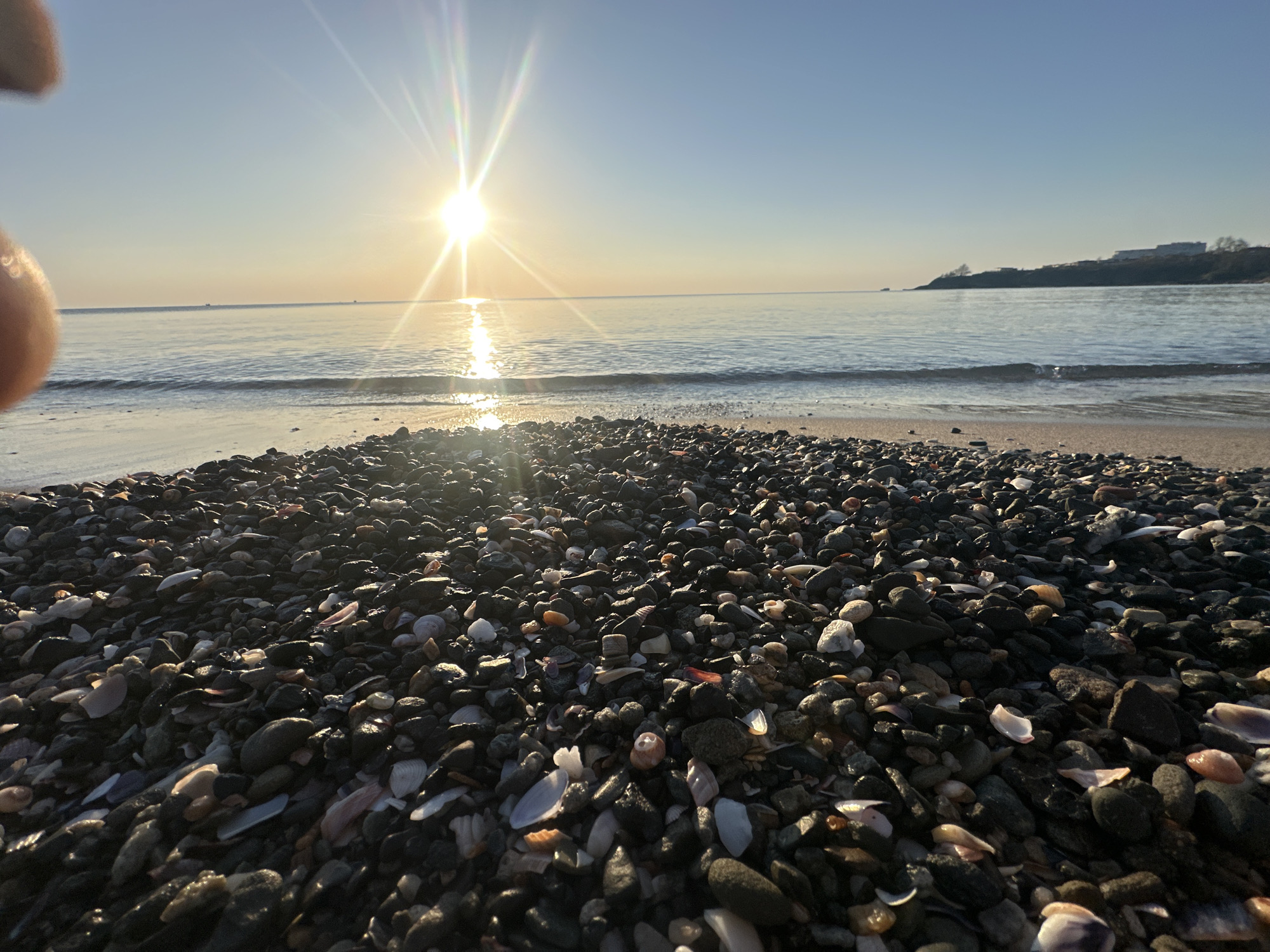 beach scene in Kiten, Bulgaria. The foreground is filled with dark pebbles and seashells. The sea is calm with small waves. The sun is low on the horizon, creating a bright glare reflecting off the water. In the distance, a small headland is visible, with buildings on top. A human finger is partially visible on the left edge of the image.