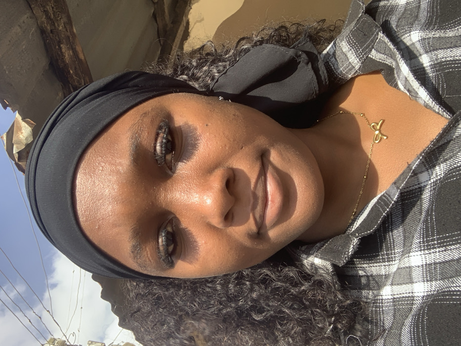 A close-up outdoor portrait of a young Black female is presented, consistent with a setting in Jos, Nigeria