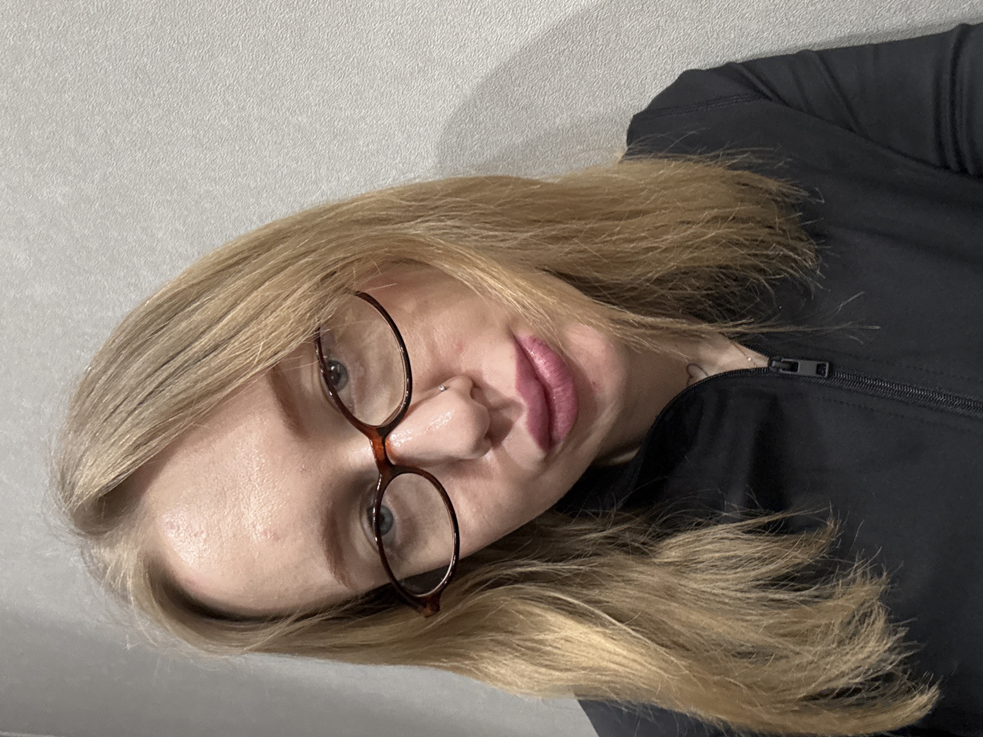 The image is a close-up shot of a woman with blonde hair and glasses. She is wearing a dark-colored zip-up jacket. The background is a plain, light-colored wall. There is no indication of the location being in the city of Unknown, Russia.