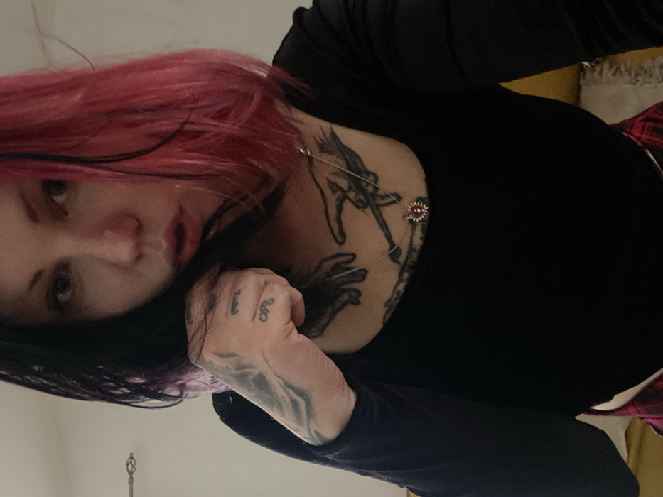 A female individual is depicted in a close-up, frontal shot, indoors in Kunje, Montenegro. She has split-dyed hair, dark on the left side and bright pink on the right, falling to approximately shoulder length. Her eyes are dark, and her mouth is slightly open. She is wearing a long-sleeved black top with a square neckline. A red and black plaid garment is visible at the bottom right of the frame. Prominent tattoos are visible on her left hand, including flowing patterns on the back and symbols on her fingers (e.g., an 'E' or '3' on the middle finger, and a stylized '69' or 'GO' on the ring finger). A large tattoo depicting two hands reaching towards each other, reminiscent of "The Creation of Adam," is visible on her upper chest, beneath her neckline. She wears a thin silver-colored chain necklace with a small, circular red pendant, featuring a silver border and central detail. Her left hand is raised, with fingers slightly curled, appearing to hold or touch a dark strand of her hair near her chin. The background consists primarily of a plain, light-colored wall. A decorative metal fixture or finial is visible on the wall in the upper left. A yellowish upholstered object and a small portion of a patterned fabric are present in the lower right background.
