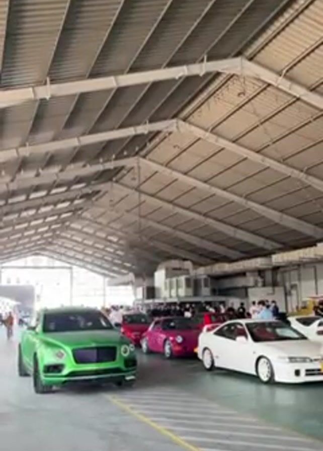 green Bentley SUV driving through a large, open building with a high, metal-beamed roof. People are milling around looking at various cars, including a red car, a pink car, and a white car. The camera follows the green Bentley as it drives slowly past the other cars. The building appears to be a car show or auction venue.
