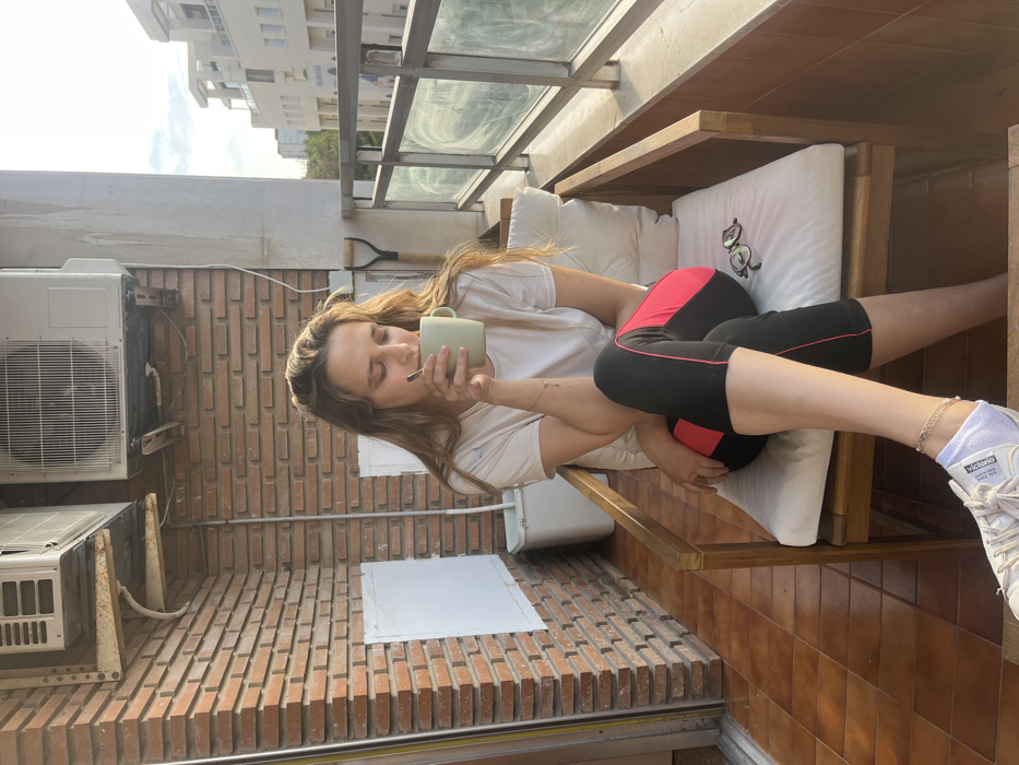 A woman with long, light brown hair sits on a white-cushioned wooden chair on an outdoor balcony in a residential area of Valencia, Spain