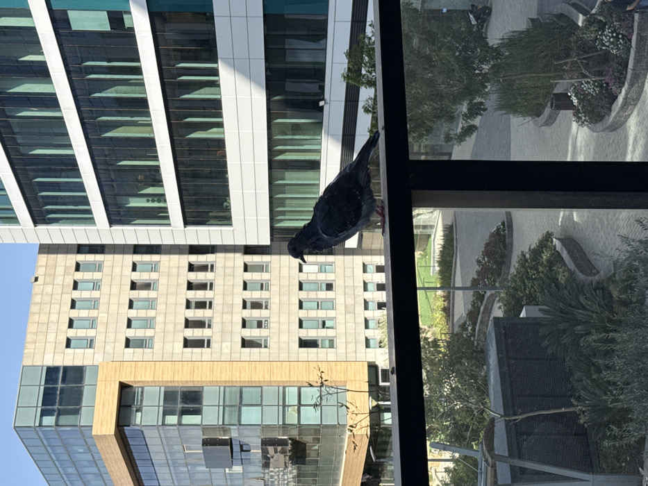 - "A dark gray pigeon with visible reddish feet is perched on a horizontal black metal railing in the foreground" by FM-S7wu32, licensed under CC BY 4.0