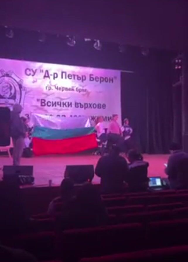 The scene appears to be a school performance taking place on a stage in front of an audience. A banner with text in Bulgarian, including "СУ "Д-р Петър Берон" гр. Червей бряг," and another line "Всички върхове за да достигне ги!", is hung in the background. In front of the banner, there's a Bulgarian flag and a group of children, possibly students, who seem to be performing a dance or skit. One adult male appears to be directing them. The stage is illuminated with a purple light, and the audience is seated in red cushioned chairs. A person wearing a hooded jacket is standing stage left, and another person is using a laptop in the audience. The scene is being recorded, most likely with a smartphone or handheld device, based on the video's composition and camera movement.
