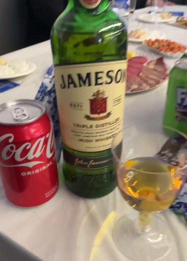 The video displays a bottle of Jameson Irish whiskey on a table alongside a glass of amber-colored liquid, a can of Coca-Cola, and a can of Fanta Exotic. The table is covered with a white tablecloth featuring a blue and white patterned runner. In the background, a plate of food, possibly cold cuts and snacks, is visible. A person's hand briefly enters the frame, lifting the glass before setting it down. The environment seems to be indoors, possibly a gathering or event. Loud, rhythmic music plays in the background.