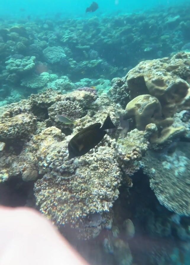 The video depicts an underwater scene featuring a coral reef. The water is clear and turquoise, with the sun reflecting on the surface. The reef is composed of various types of coral in shades of brown, grey, and some with hints of pink and purple. Several fish are visible, including one large, dark-colored fish and a smaller, silver-grey fish that comes close to the camera. The camera moves slightly, showing more of the reef and the marine life within it. A human finger momentarily appears in the bottom left corner of the frame.