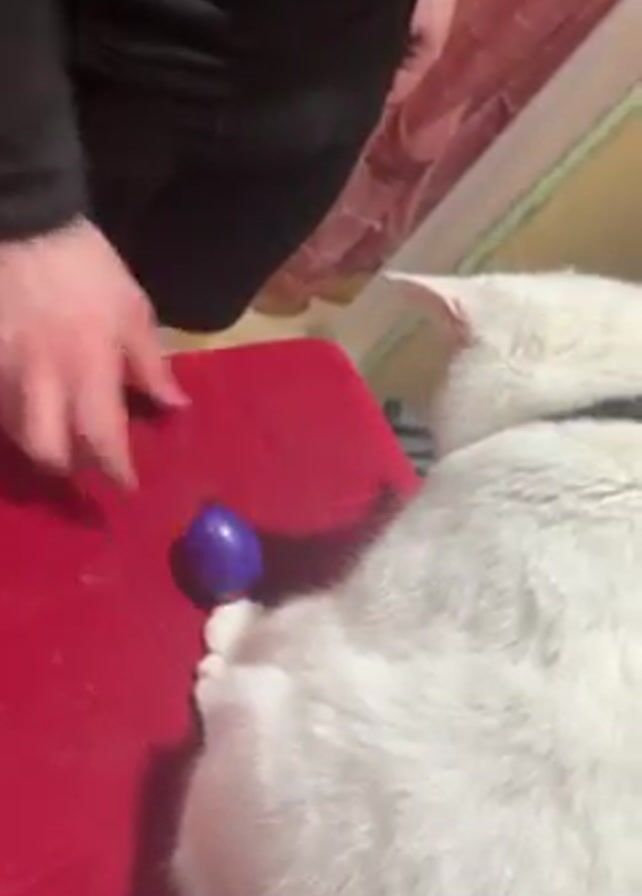 white cat lying on a red cushion, while a person places a purple plastic egg next to it