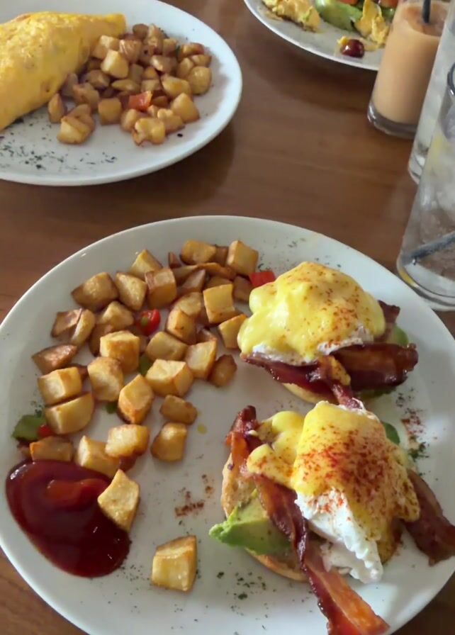 breakfast table with plates of food. One plate contains an omelet and diced potatoes. Another plate has scrambled eggs with avocado and what appears to be tomatoes and possibly other ingredients. The main plate in the foreground has two Eggs Benedict with bacon and avocado, diced potatoes, and a dollop of ketchup. There are glasses of water and a drink with a straw on the table as well. People can be seen in the background around the table, with one person holding silverware. The table itself is a wood surface.