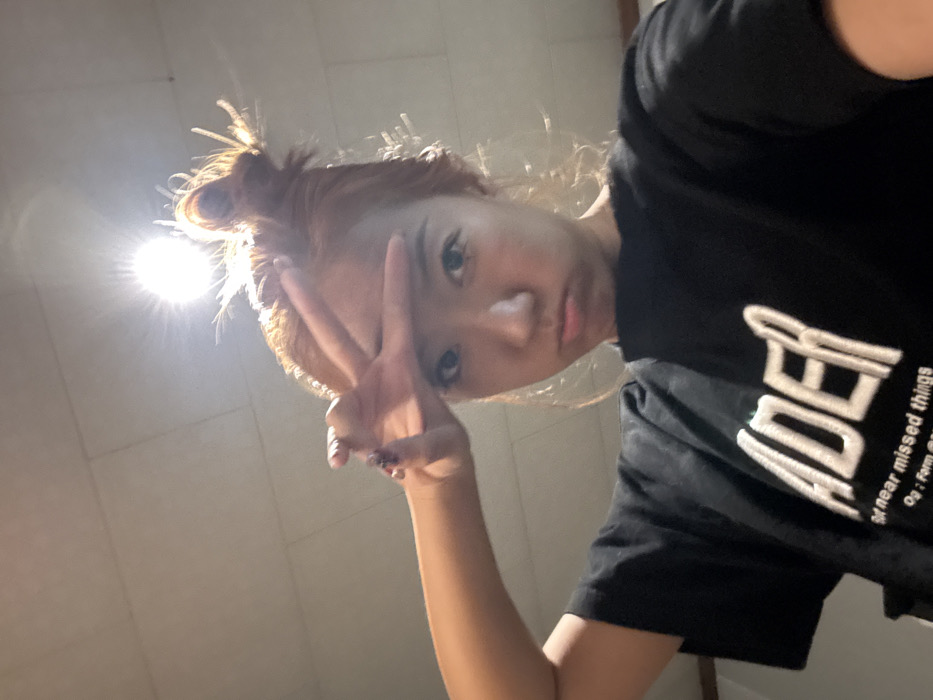 A person is holding up a peace sign. They have their hair in a messy bun and are wearing a black t-shirt with white lettering. The picture is taken from a low angle, looking up at the person. The background is a light, plain wall with a bright light in the upper left corner. The image appears to be taken indoors.