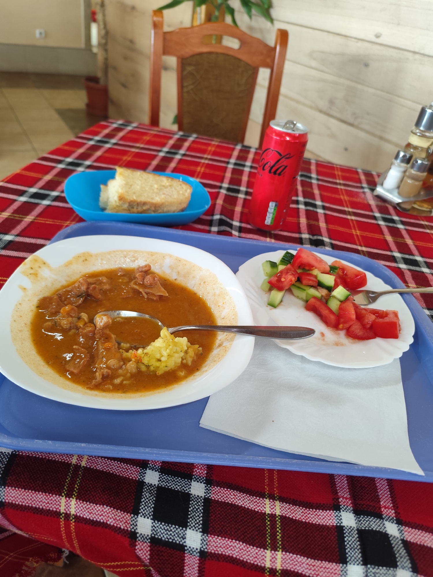 The image depicts a meal served on a blue plastic tray, placed on a red and black checkered tablecloth. The meal consists of a white plate containing a stew with meat and rice, a side plate with chopped cucumbers and tomatoes, and a slice of bread on a blue plate. A spoon rests in the stew, and a fork rests beside the salad. A can of Coca-Cola and a salt and pepper shaker are also visible on the tablecloth. The scene is likely within a restaurant setting in Haskovo, Bulgaria. A wooden chair is visible in the background.