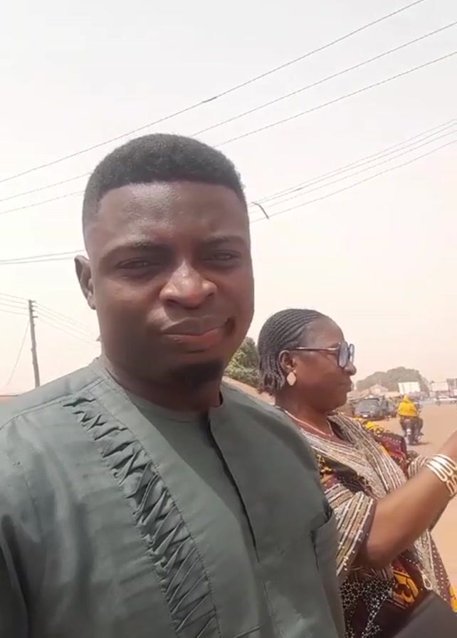 A man and a woman are standing on the side of a street. The man is holding a phone and filming himself. He is wearing a dark green shirt. The woman is standing behind him, wearing a patterned top and sunglasses. She is also holding a phone. There are cars and motorcycles driving on the street in the background. The sky is bright. There are power lines visible overhead. A tree is on the right.
