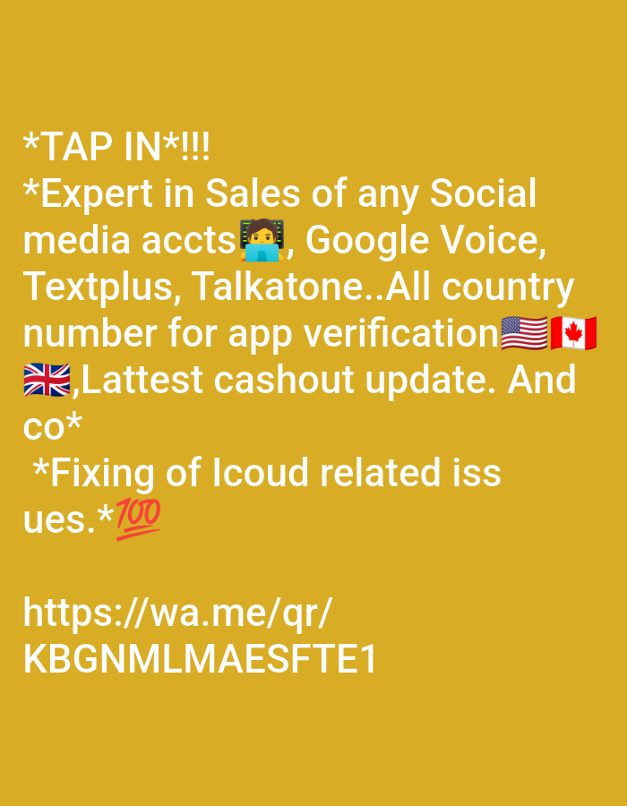 This image is a digital graphic featuring white text on a solid mustard yellow background, functioning as an advertisement for various digital services. The text content reads: '*TAP IN*!!! *Expert in Sales of any Social media accts π§βπ», Google Voice, Textplus, Talkatone..All country number for app verification πΊπΈπ¨π¦π¬π§,Lattest cashout update. And co* *Fixing of Icloud related issues.*π―'. A WhatsApp contact link, 'https://wa.me/qr/KBGNMLMAESFTE1', is prominently displayed at the bottom. The ad includes a person-at-computer emoji (π§βπ»), the 100 points symbol (π―), and national flags for the United States (πΊπΈ), Canada (π¨π¦), and the United Kingdom (π¬π§). The image itself contains no visually discernible people, physical subjects, objects, actions, interactions, or environmental details. This digital content is described as being associated with the city of Shagamu, Nigeria.