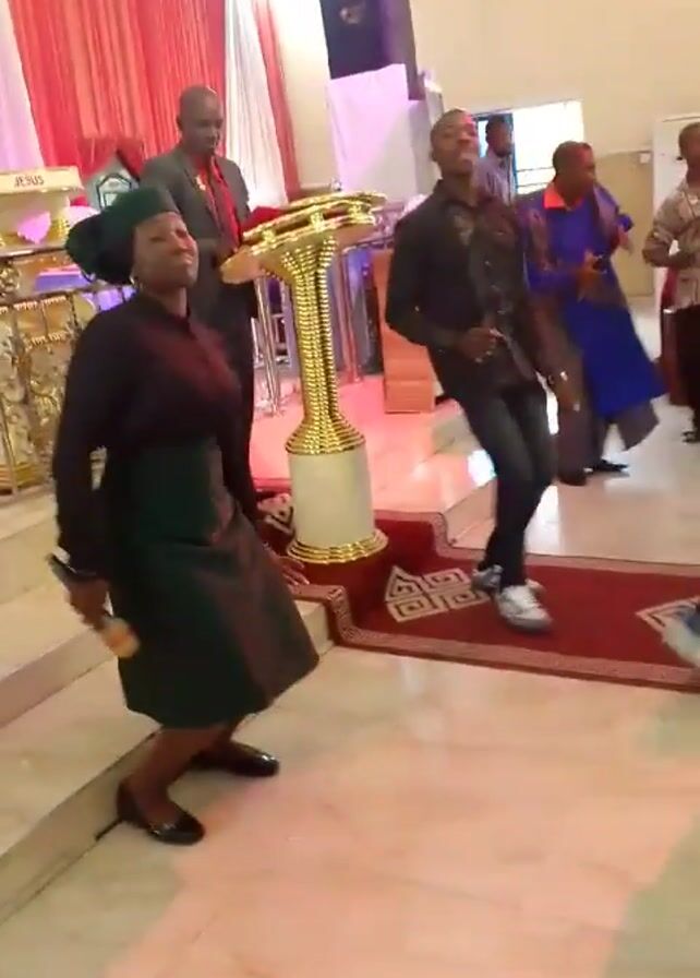 group of people dancing in what appears to be a church or religious hall. The hall has red carpets and a golden podium. There are men in suits and casual clothes, and at least one woman in a green skirt and black top is dancing. The lighting alternates between warm and blue, and a screen is visible in the background. The overall impression is lively and celebratory.