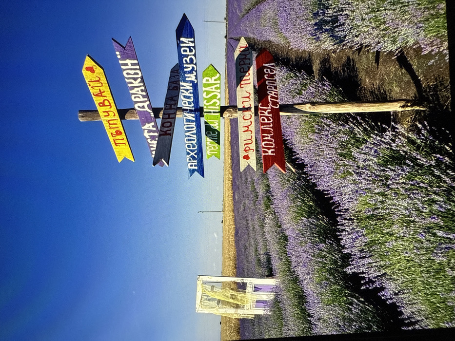 The image depicts a rural landscape in Lukovit, Bulgaria, under a clear blue sky. In the foreground, a multi-directional wooden signpost stands, bearing seven painted arrow-shaped signs with Cyrillic text and one with Latin text, indicating various local destinations such as "Travel," "Dragon Track," "Horse Base," "Archaeological Museums," "Thermae of Hissar," "Roman Thermae," and "Complex Starosel." The signpost is positioned amidst a vast field of blooming purple lavender, planted in distinct rows that recede into the distance. A narrow dirt path is visible between some of the lavender rows, particularly beneath the signpost. To the left, further into the lavender field, a freestanding white door frame with purple accents and a sheer, light-colored fabric draped over its top creates an ornamental feature. Beyond the lavender field, a golden-brown field of cultivated crops, likely grain, extends to the horizon. A single utility pole with wires is visible in the distant background, separating the lavender and golden fields. Shadows are cast by the signpost and within the lavender rows, indicating bright sunlight. No individuals are present in the scene.