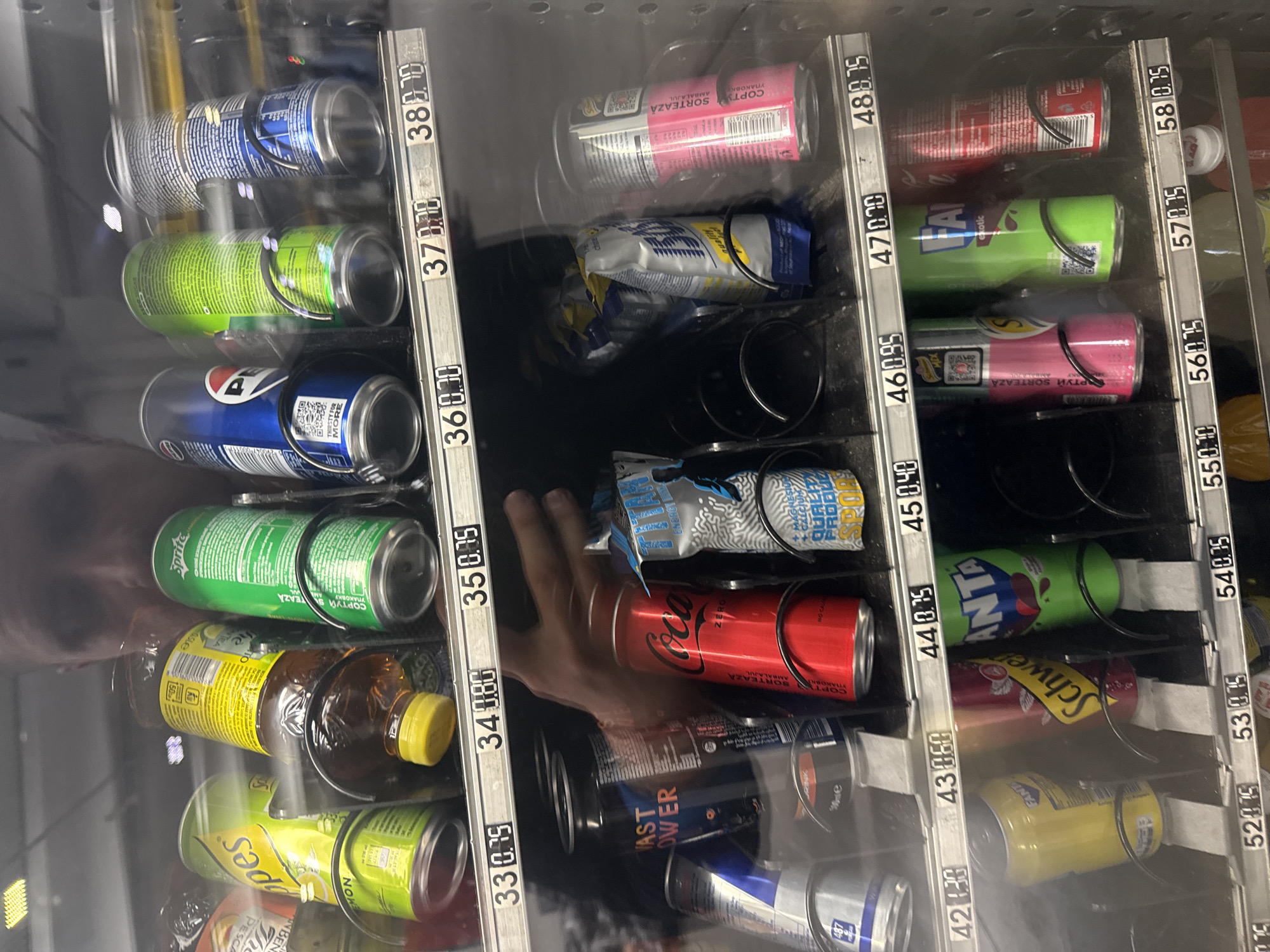 inside of a vending machine, filled with various cans and bottles of beverages. The vending machine has labeled prices next to each row of items. The top row contains what appear to be energy drinks, followed by various sodas and other bottled drinks. A human hand is reaching into the vending machine, obscuring some of the products. It can be inferred that this image was taken in Vratsa, Bulgaria, due to the text on the beverage cans, which are written in Bulgarian.