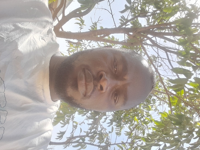 The specific location within Barakin Acha, Nigeria, is not discernible from the visual evidence. The image depicts an adult male, with dark skin, short dark hair, and a trimmed beard, looking directly forward with a neutral expression. He is wearing a light-colored, likely white, crew-neck t-shirt with visible creases. The background features tree branches with green leaves, illuminated by bright daylight, against a clear sky, indicating an outdoor, sunny environment.