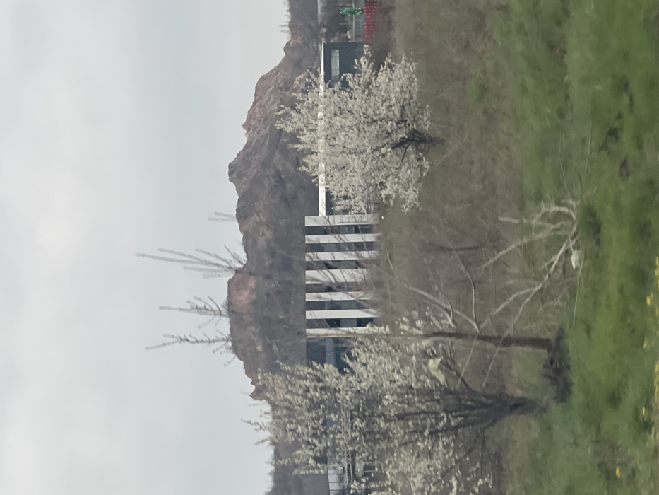 The image presents an outdoor scene in Krepost, Bulgaria, under an overcast sky. In the background, a range of low, textured hills or mounds, appearing reddish-brown and grey, is visible, topped with several bare, vertically elongated tree structures. Below these formations, a modern, rectangular building occupies the midground. This building features a facade with distinct alternating vertical stripes of black and reflective white panels. Two deciduous trees, fully adorned with white blossoms, are prominently positioned in the mid-to-foreground, partially obscuring the building; one is on the left, and another is on the right. To the far right of the building, a large, green humanoid-shaped object stands partially visible behind a red barrier or fence-like structure. The immediate foreground consists of a field of green grass, interspersed with patches of dry brown vegetation and small yellow flowers. Several bare, thin tree trunks and fallen branches are scattered across this foreground area, with some white debris or objects visible on the ground or tangled within the branches. No individuals are present in the frame, and no discernible actions or interactions are taking place.