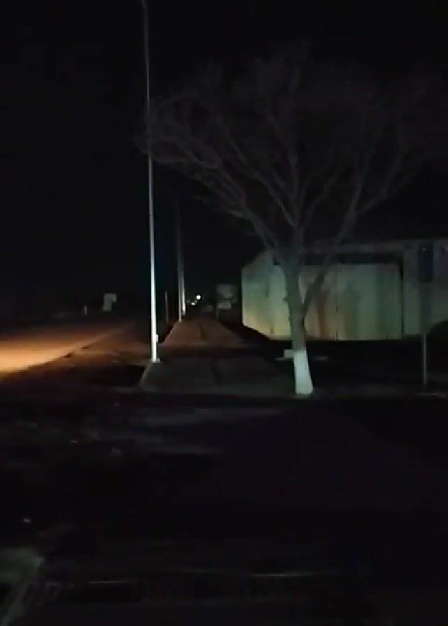 dark street scene at night. A sidewalk runs along the side of the road, illuminated by streetlights. A leafless tree stands next to the sidewalk. A building is visible to the right of the tree. A car with its headlights on approaches from the left in the distance.