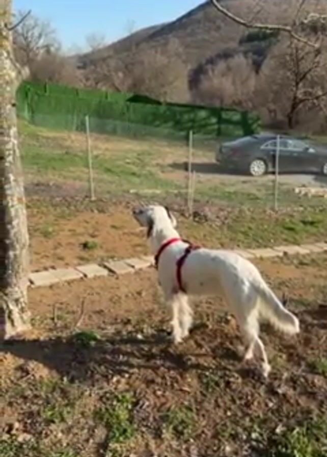 A white English Setter dog with black spots and a red harness is standing in a grassy yard, looking up at a tree. The camera pans over to the tree to reveal a butterfly perched on the bark. Behind the dog and the tree is a chain-link fence, a green hedge, and a dark-colored car. In the background is a hill covered in trees. The sky is blue and clear.