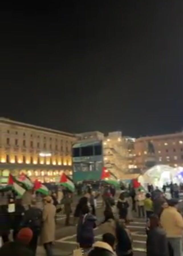 night time view of a plaza with a crowd of people holding Palestinian flags. The plaza is surrounded by illuminated buildings. There are a few decorative light structures in the middle of the plaza. The camera slowly pans left, revealing more of the crowd and the architecture of the buildings. The Duomo di Milano is visible on the left side of the screen.