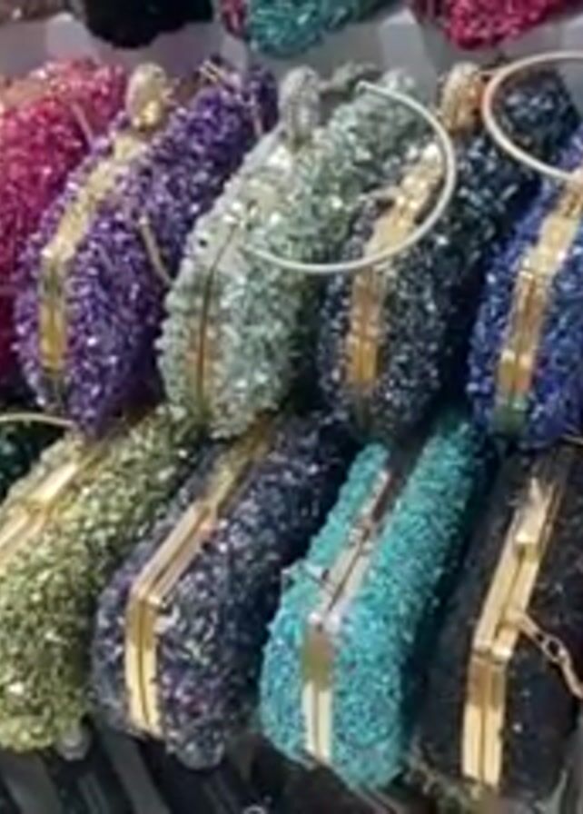 A close-up video shows a display of small, box-shaped evening bags