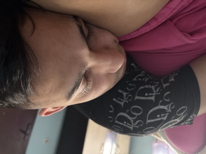 - "An overhead-angle image depicts an adult male asleep or resting, positioned on a pink fabric surface within an indoor residential setting in Gorna Rositsa, Bulgaria" by FM-UlzaA3, licensed under CC BY 4.0
