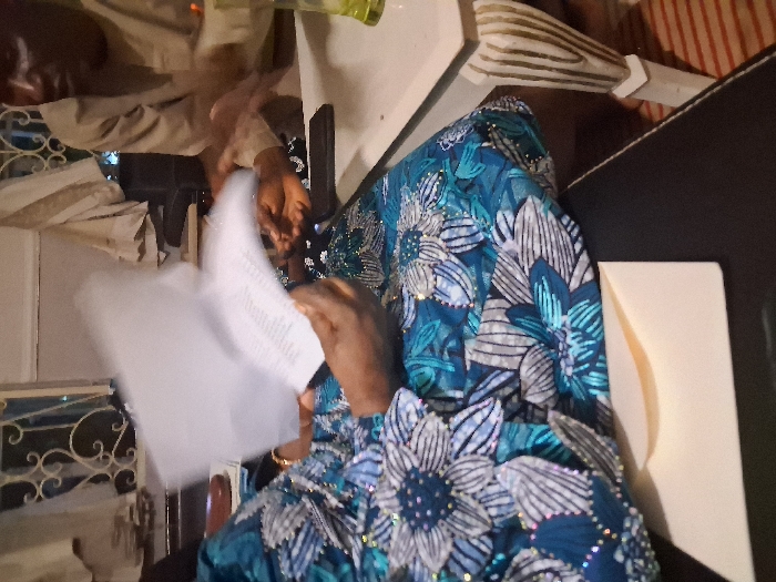 This image depicts an indoor scene in the city of Howayi, Nigeria, featuring two individuals engaged in a discussion. In the foreground and left, a person is seated, their lower torso, arms, and hands visible. They are wearing a vibrant blue and white patterned garment adorned with floral designs and small iridescent embellishments. This individual holds a stack of white papers, some of which appear blurred due to motion, possibly from turning pages or movement during the photograph. Below this person's arm, a light-colored envelope rests on a dark upholstered surface. To the right, a second individual, a male, is partially visible from the chest up, wearing a light-colored, long-sleeved top. He is seated across a white table with a decorative carved leg. His right hand is raised, extended forward, in what appears to be a gestural communication. Between the two individuals, on the table, lies a dark-colored smartphone. Further to the right on the table, a green-tinted glass or container is partially visible. The background includes a window with white decorative metalwork and drapes. The overall lighting suggests an interior setting, possibly a residence or office.